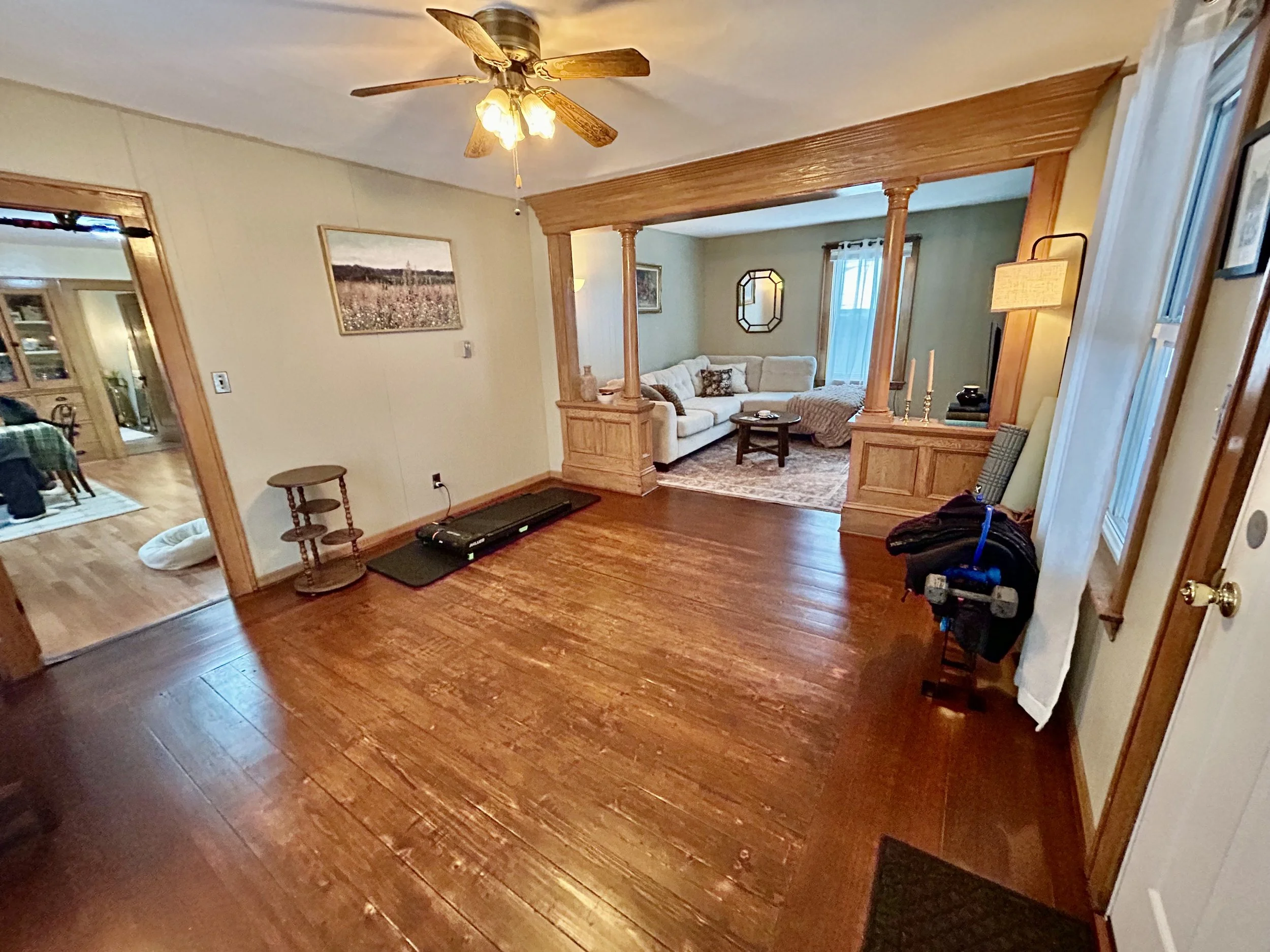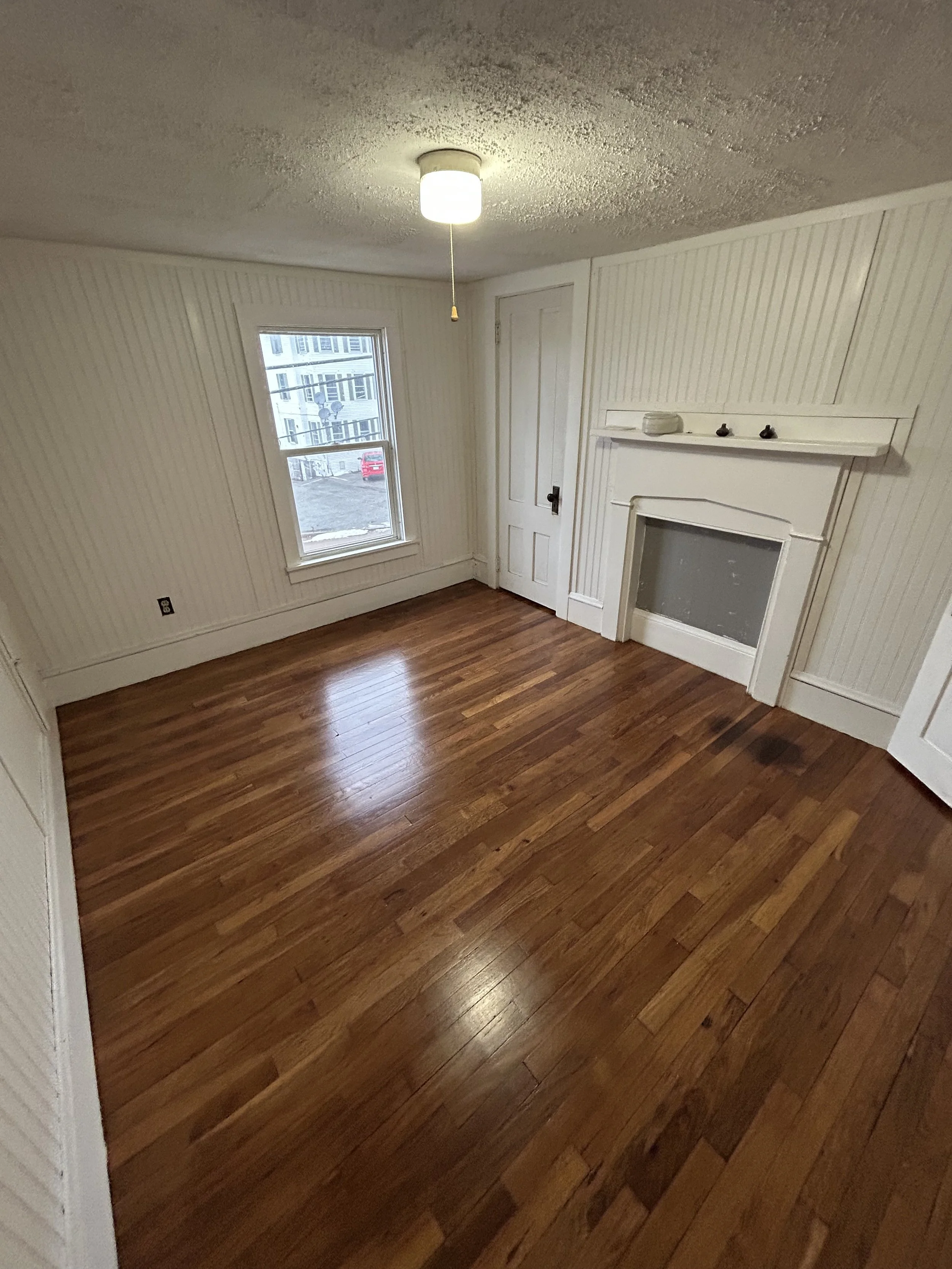 Hardwood floors, exposed chimney